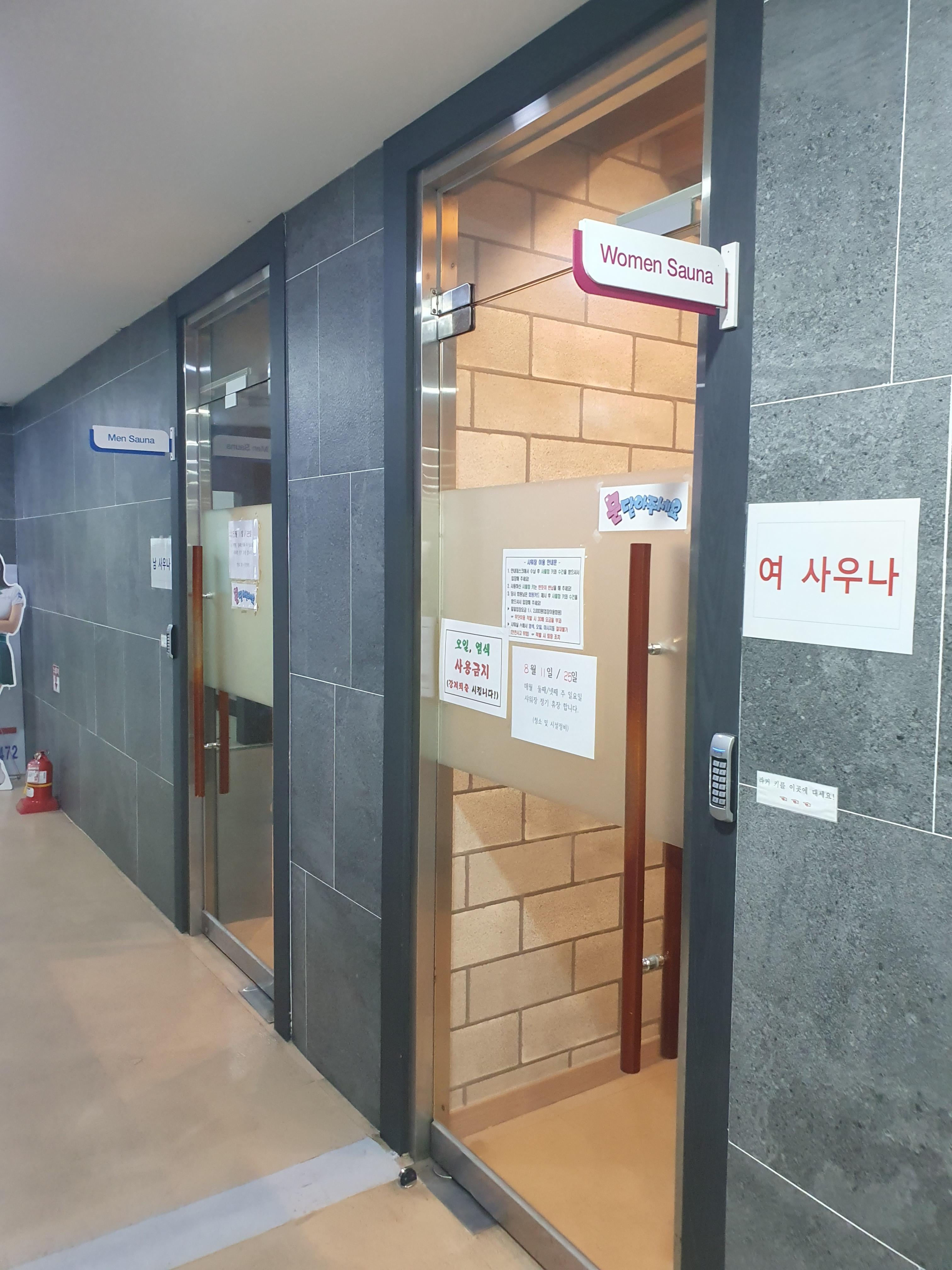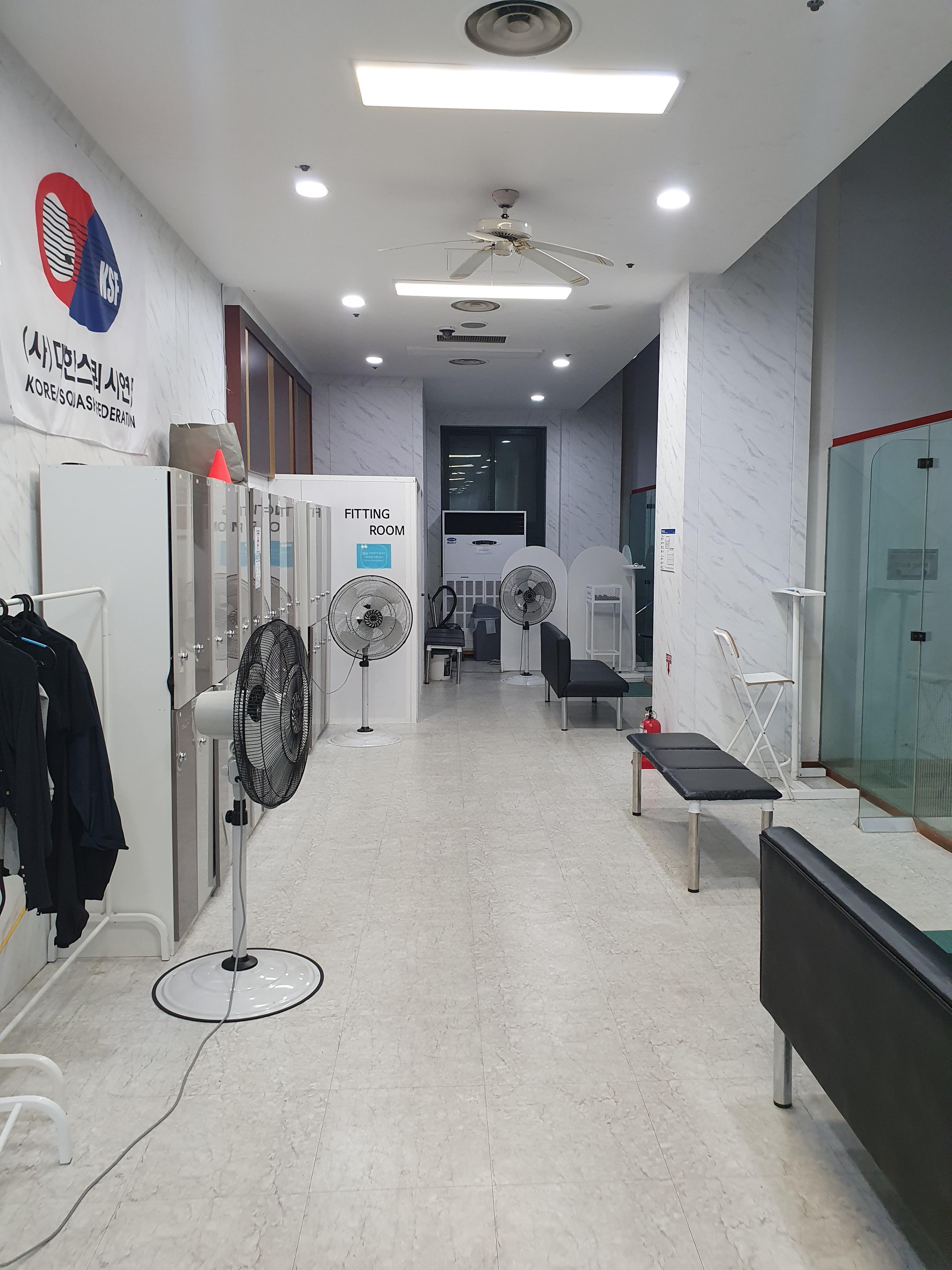 스쿼시장 한쪽 구석에 위치하고있는 남여구분이 되어있는 피팅룸입니다.