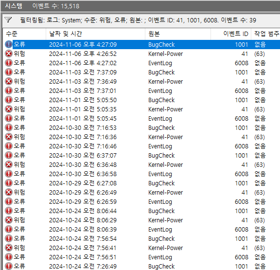 심각한 마음으로 찾아보던 중 이벤트 뷰어에 시스템 로그에서 아래와 같은 메시지들을 찾을 수 있었다.