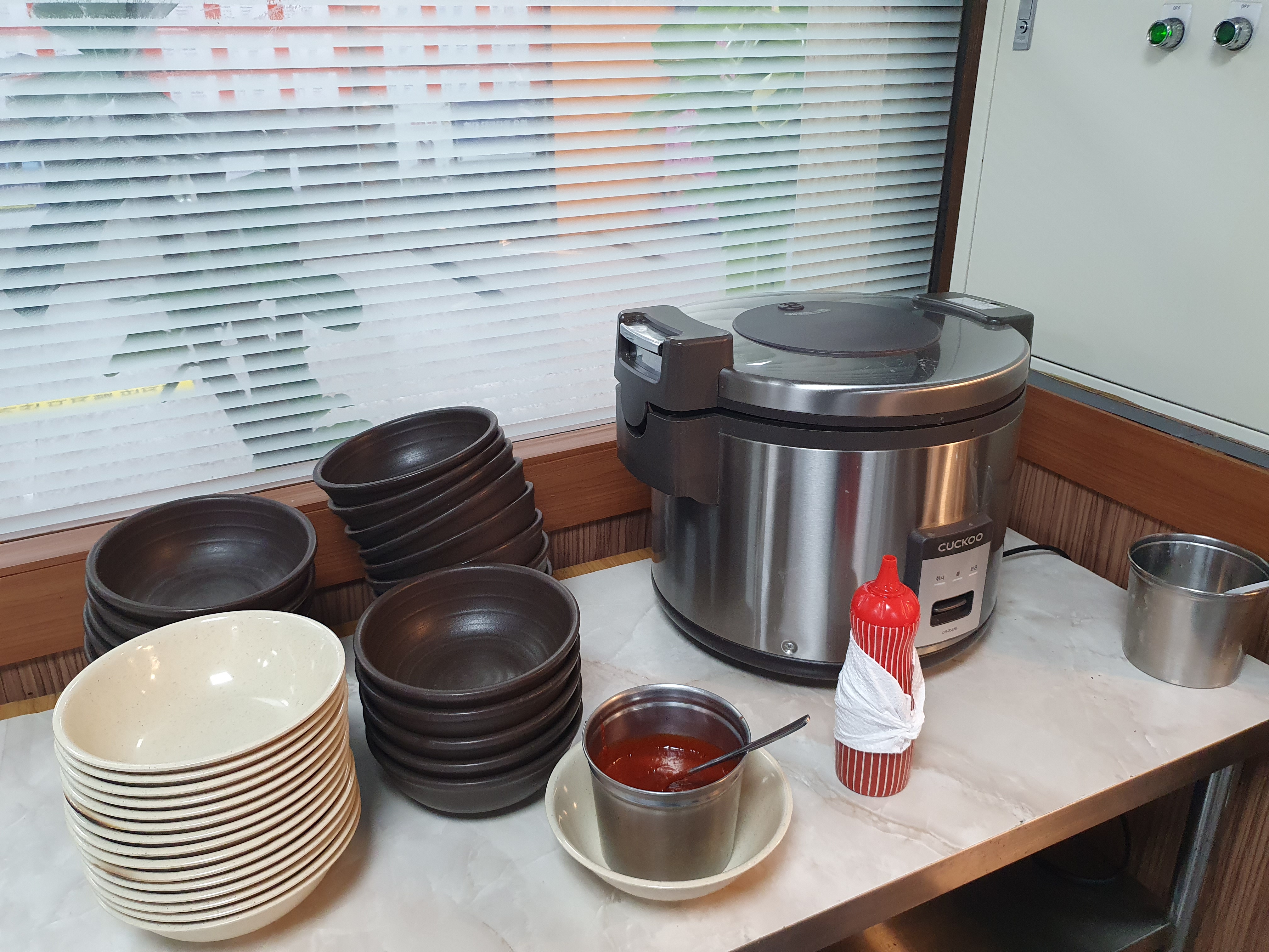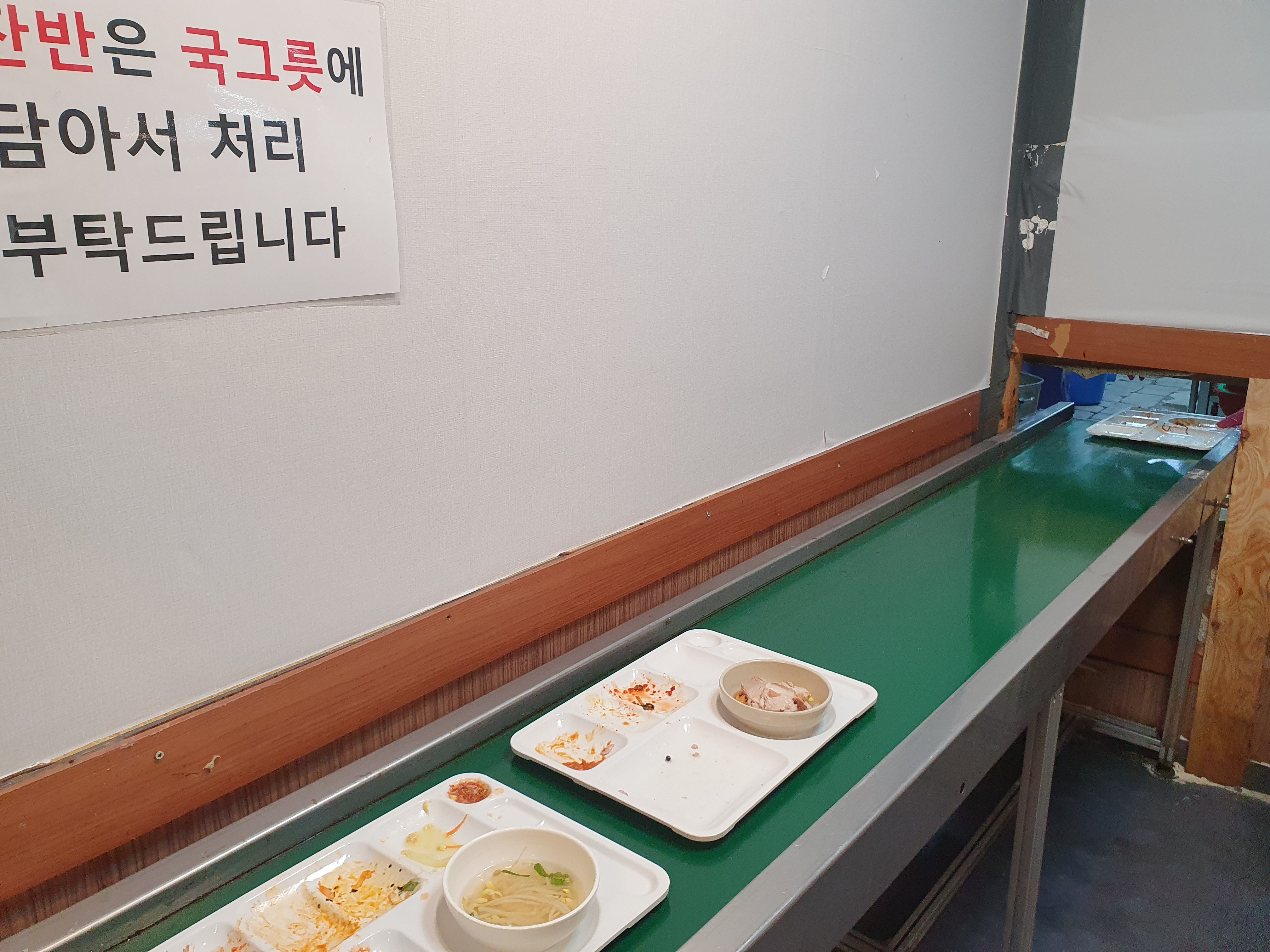 따로 쓰레기와 수저는 다른곳에 넣고 식판만 올려두는 시스템입니다.