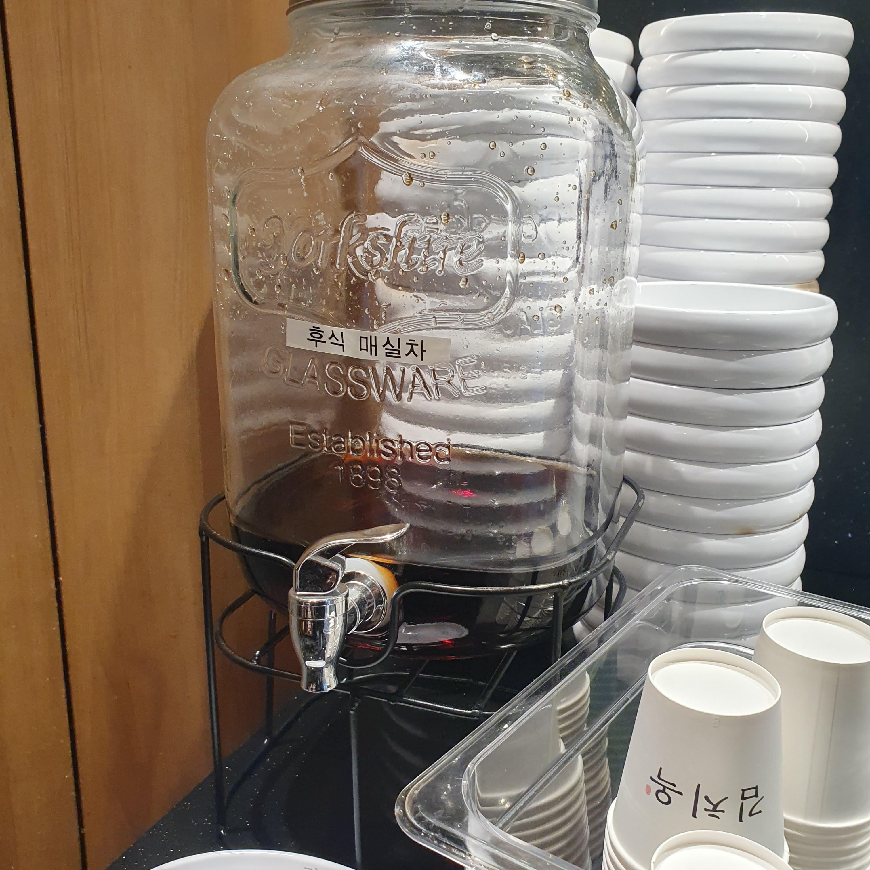 한쪽에는 매실차와 간단한 야채들이 준비되어있는 셀프코너가 있습니다.