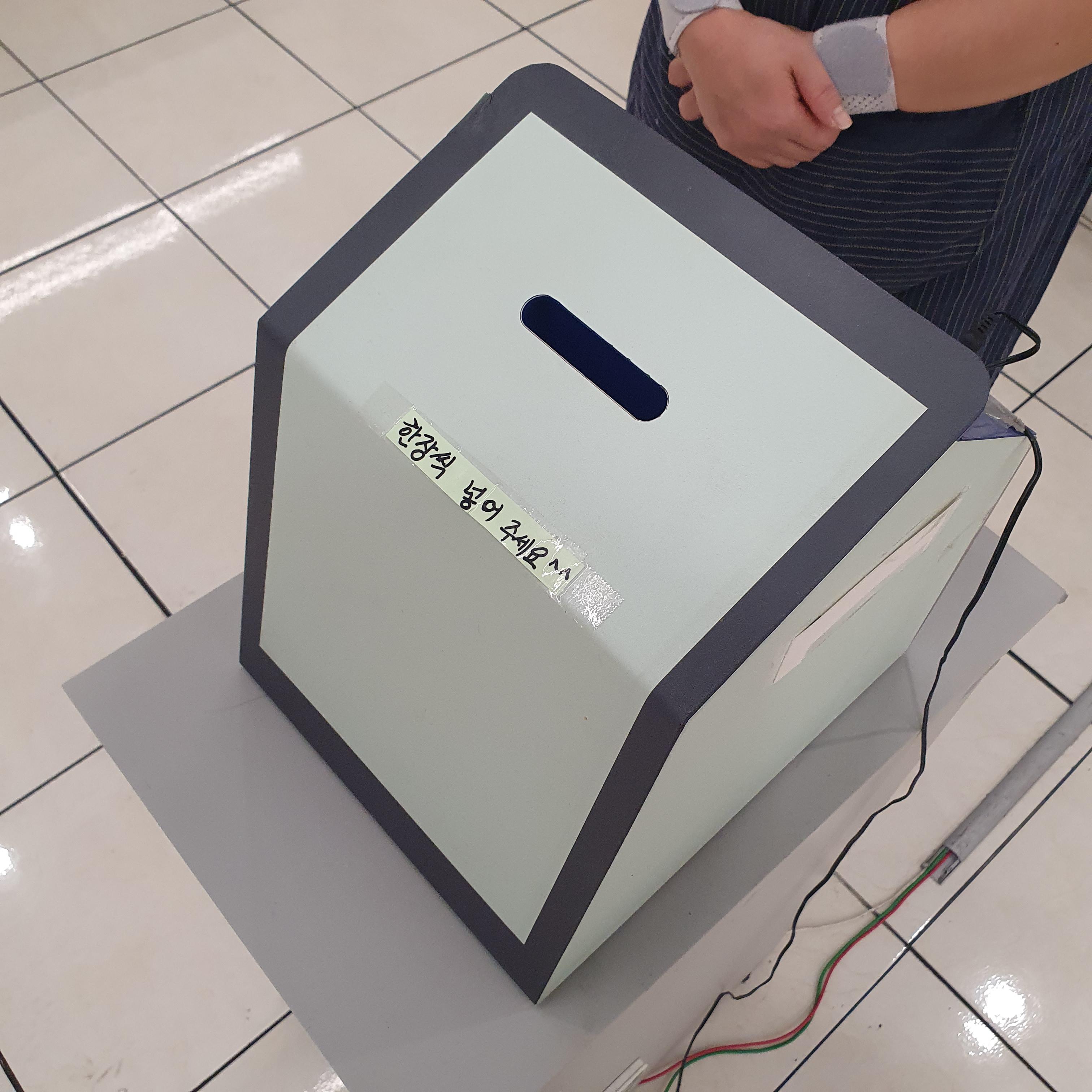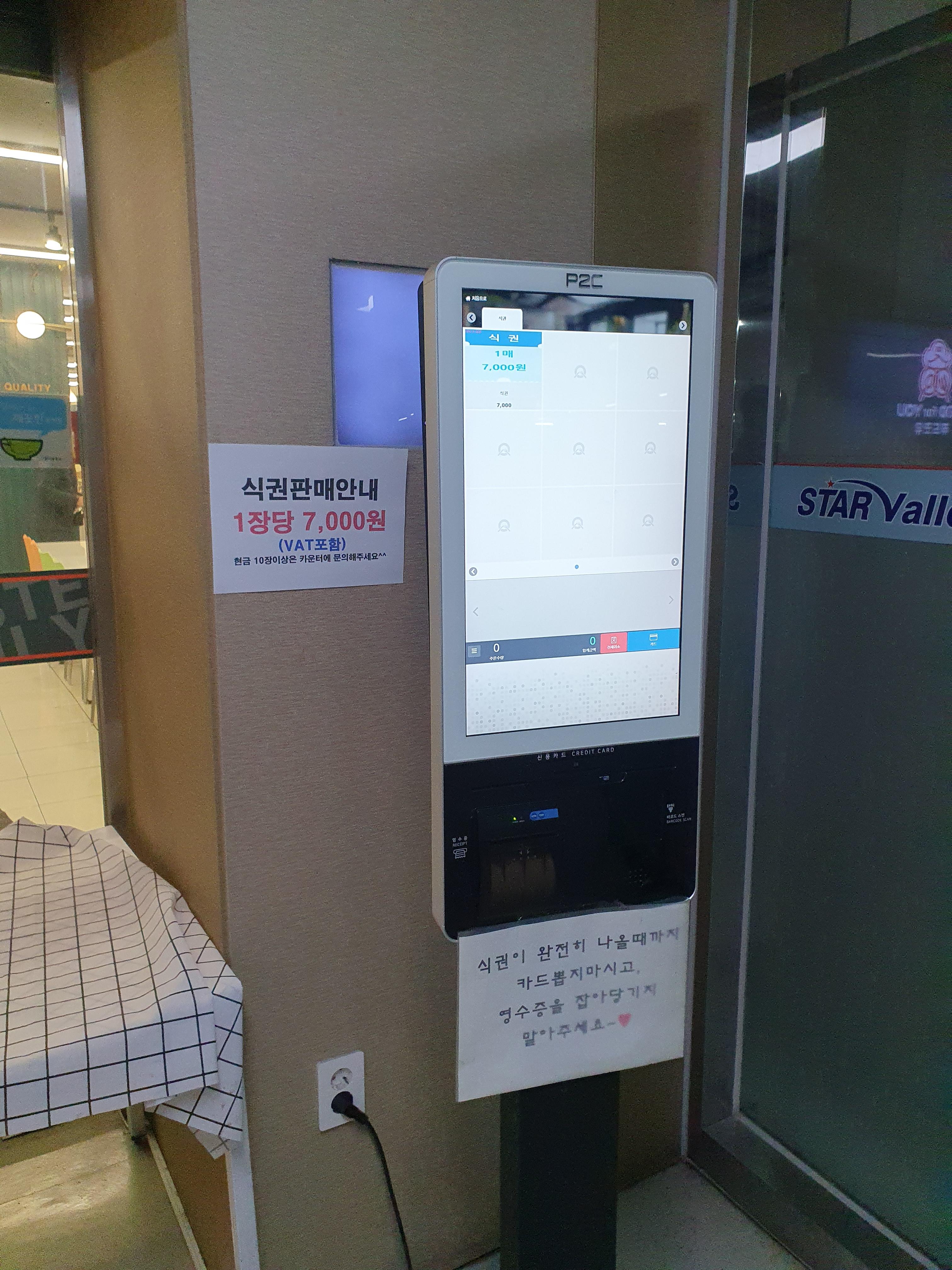 입구밖에있는 키오스크에서 식권을 결제하여, 식권표를 받아오고 배싱대 앞에있는 통에 넣어주면됩니다 ^^