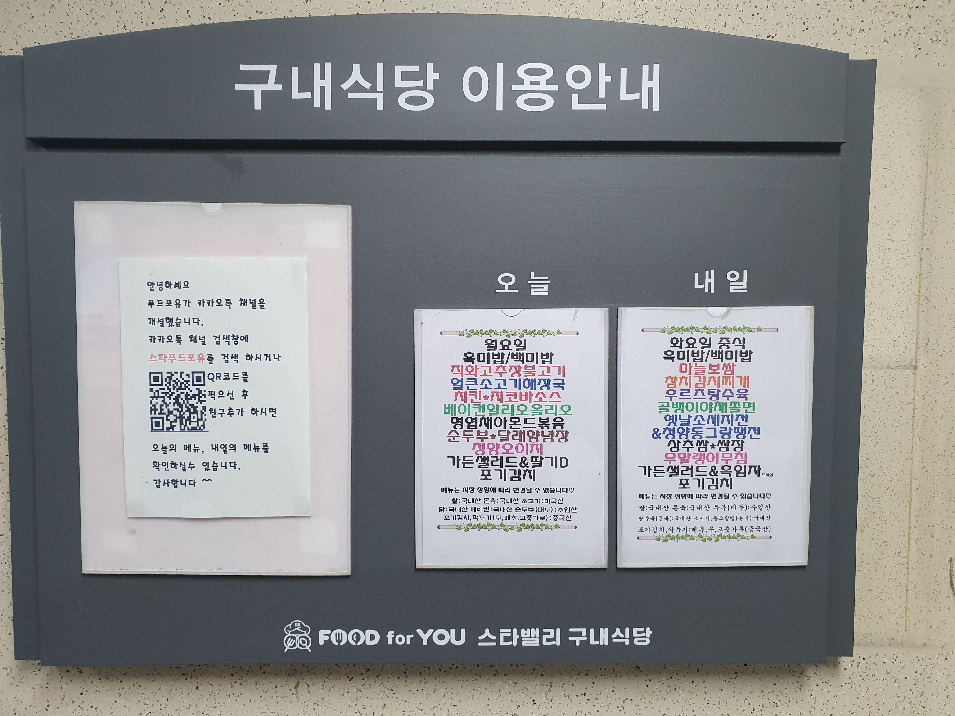 가산디지털단지의 스타밸리라는 건물의 푸드포유 구내식당입니다.