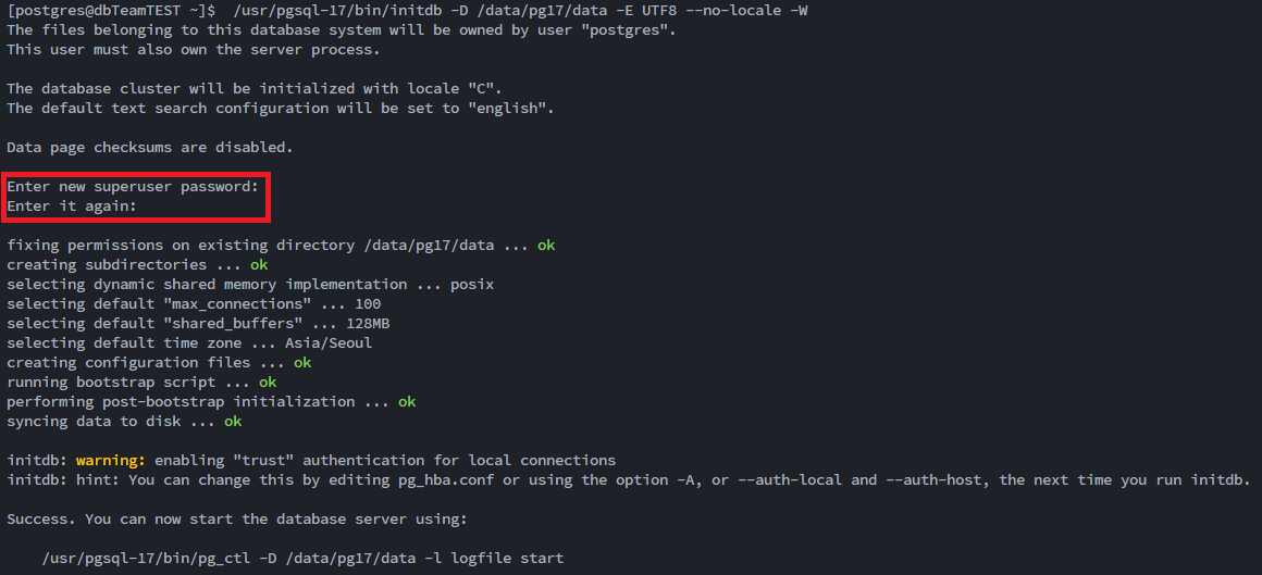 /usr/pgsql-17/bin/initdb -D /data/pg17/data -E UTF8 --no-locale -W