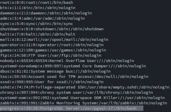 postgres:x:26:26:PostgreSQL Server:/usr/pgsql-17:/bin/bash