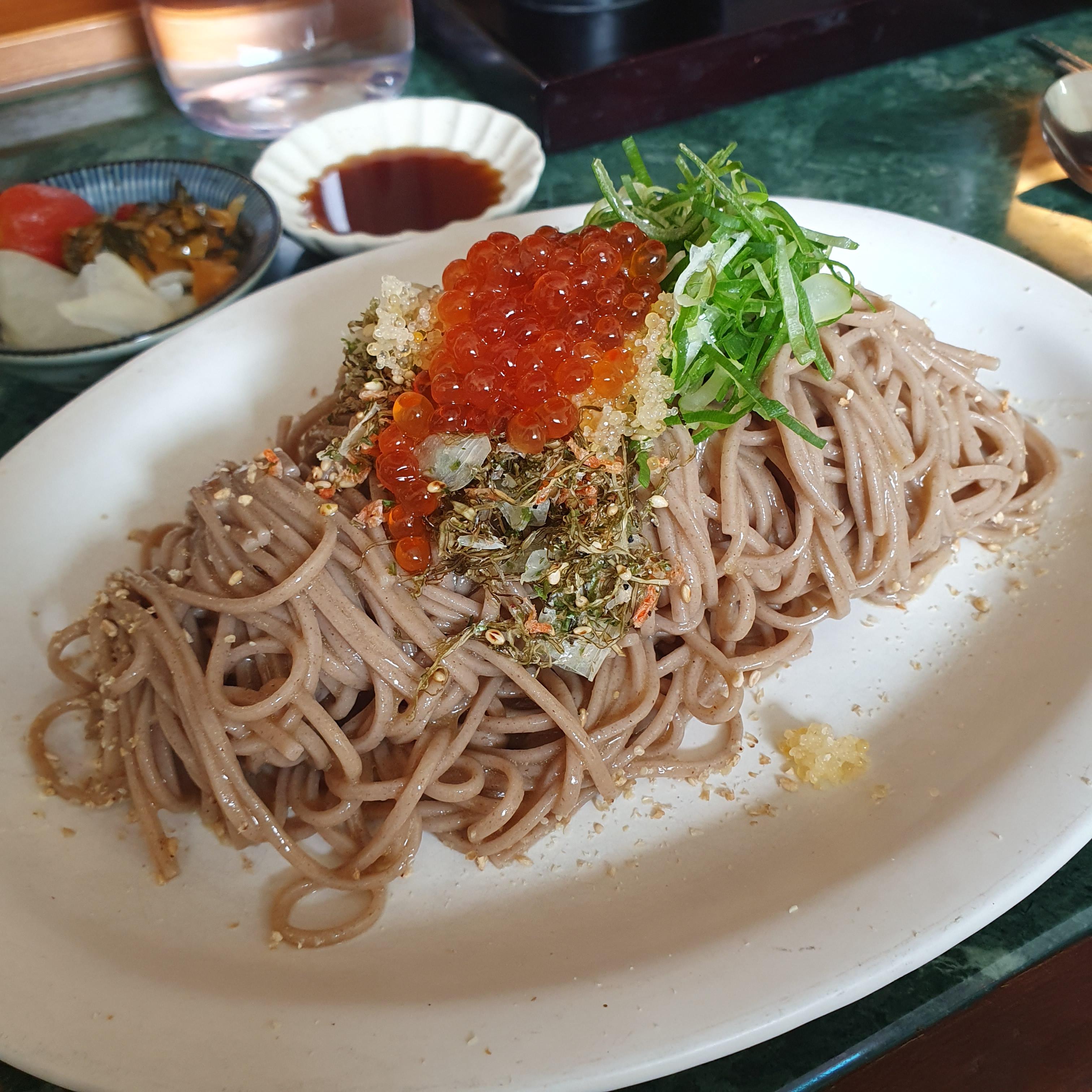 두번째 메뉴로는 들기름 연어알 소바가 나왔습니다.