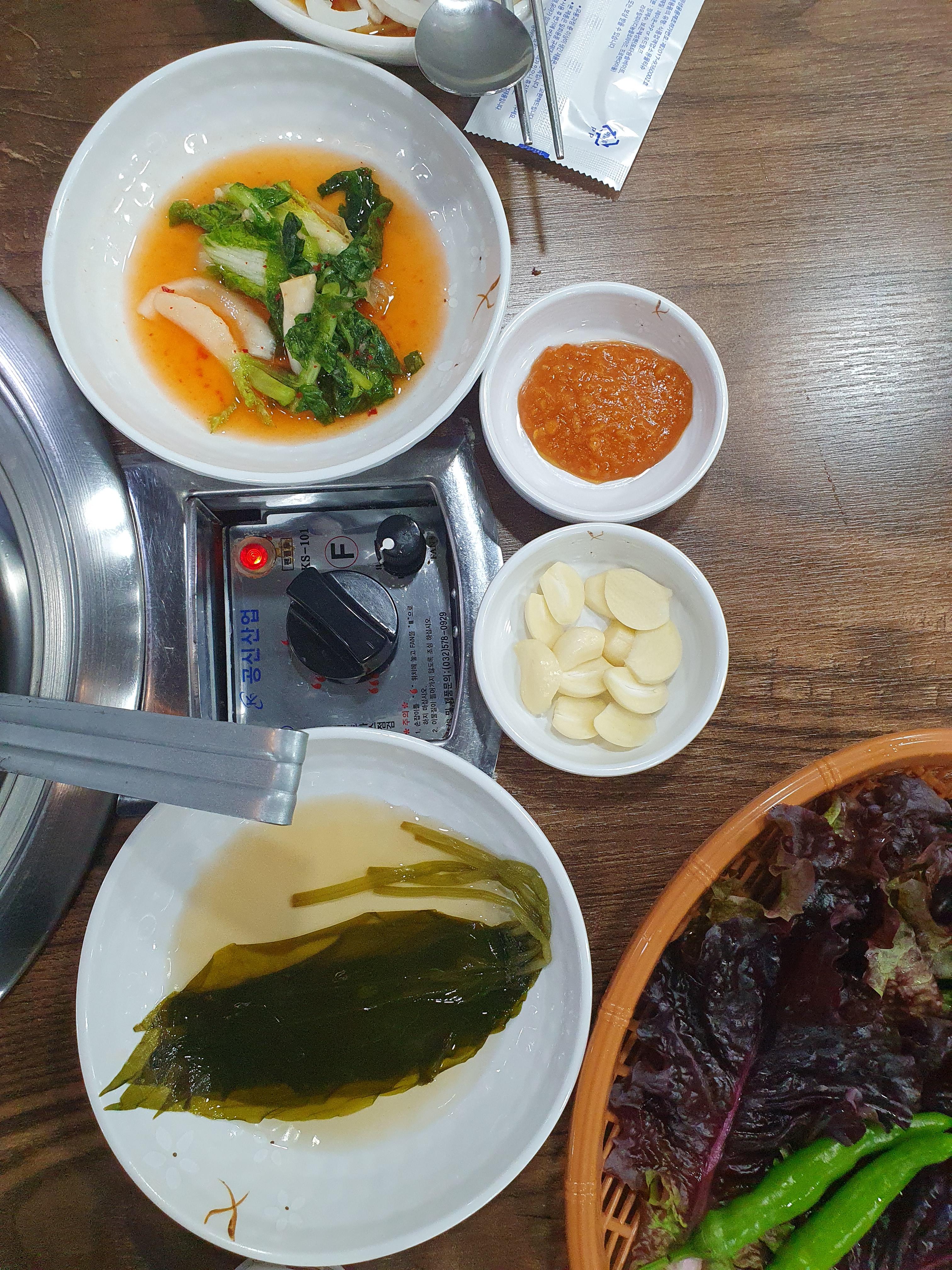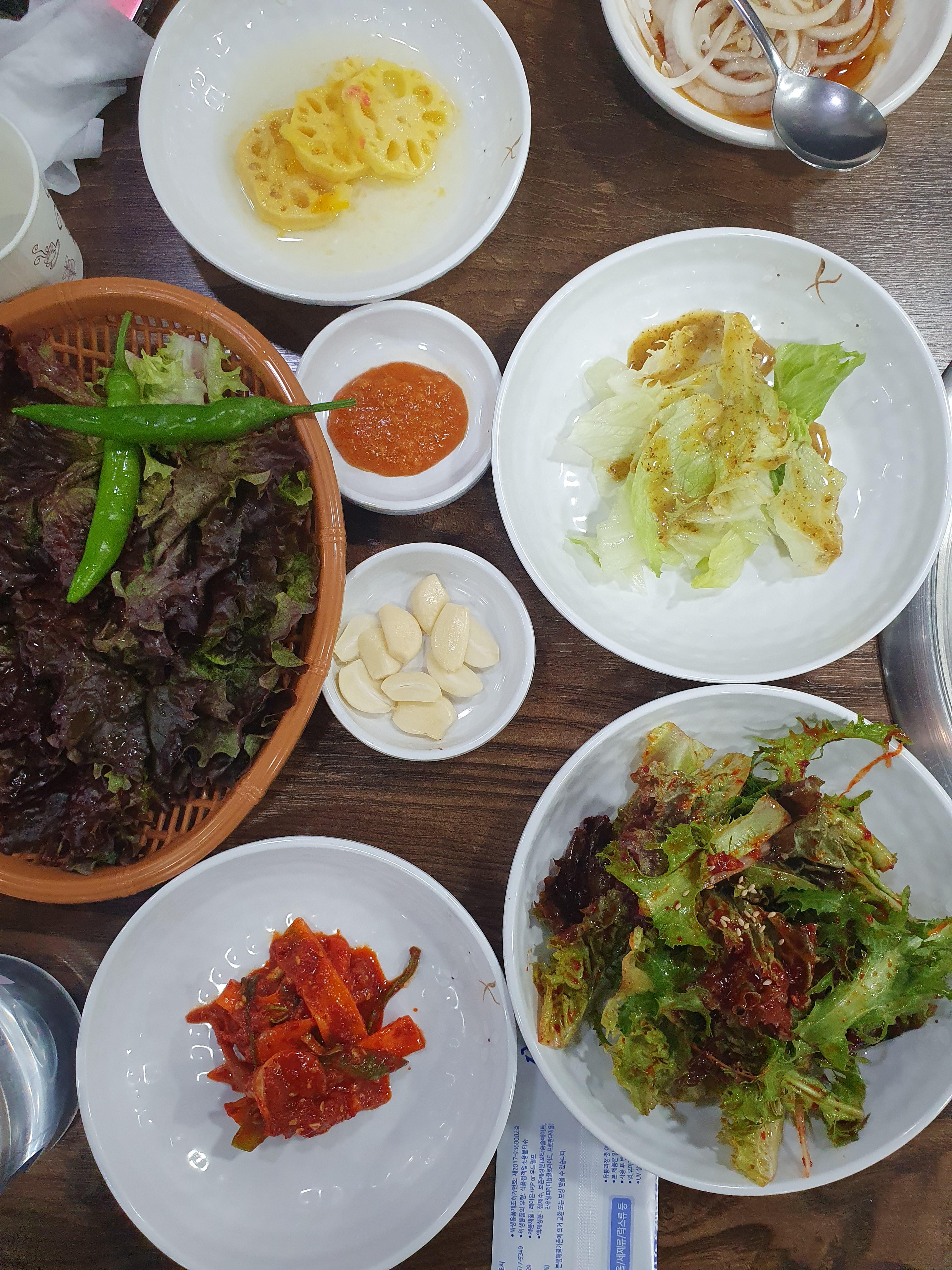 여러 쌈채소와 반찬들 그리고 찌개가 나오네요.