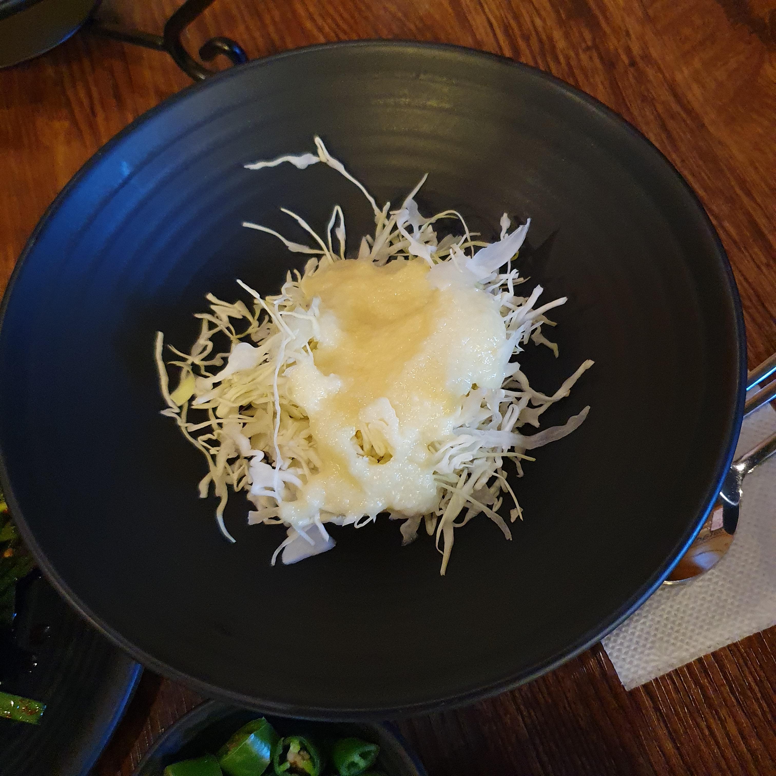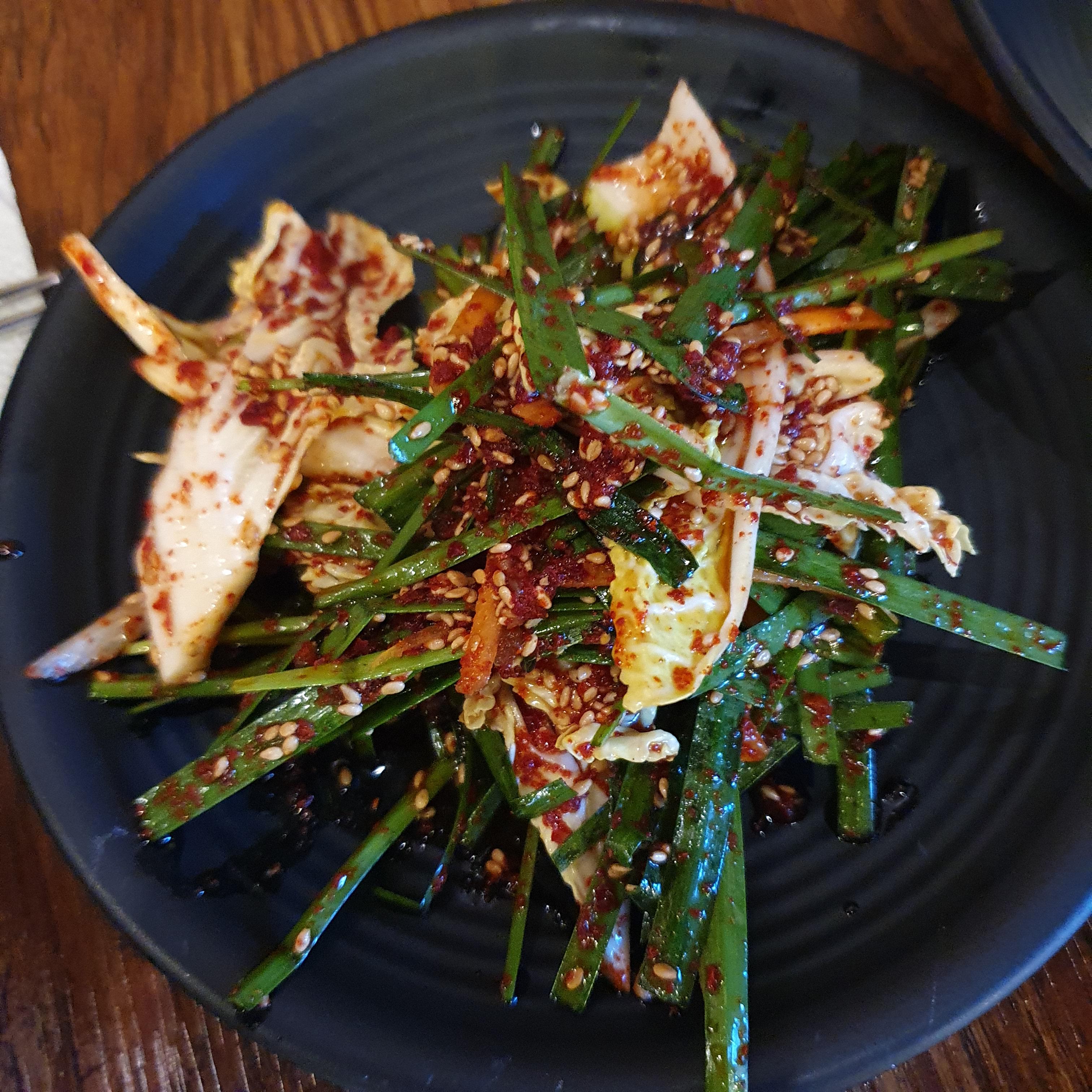 양배추 샐러드와, 부추무침도 곁들여 먹을 차림으로 나옵니다.