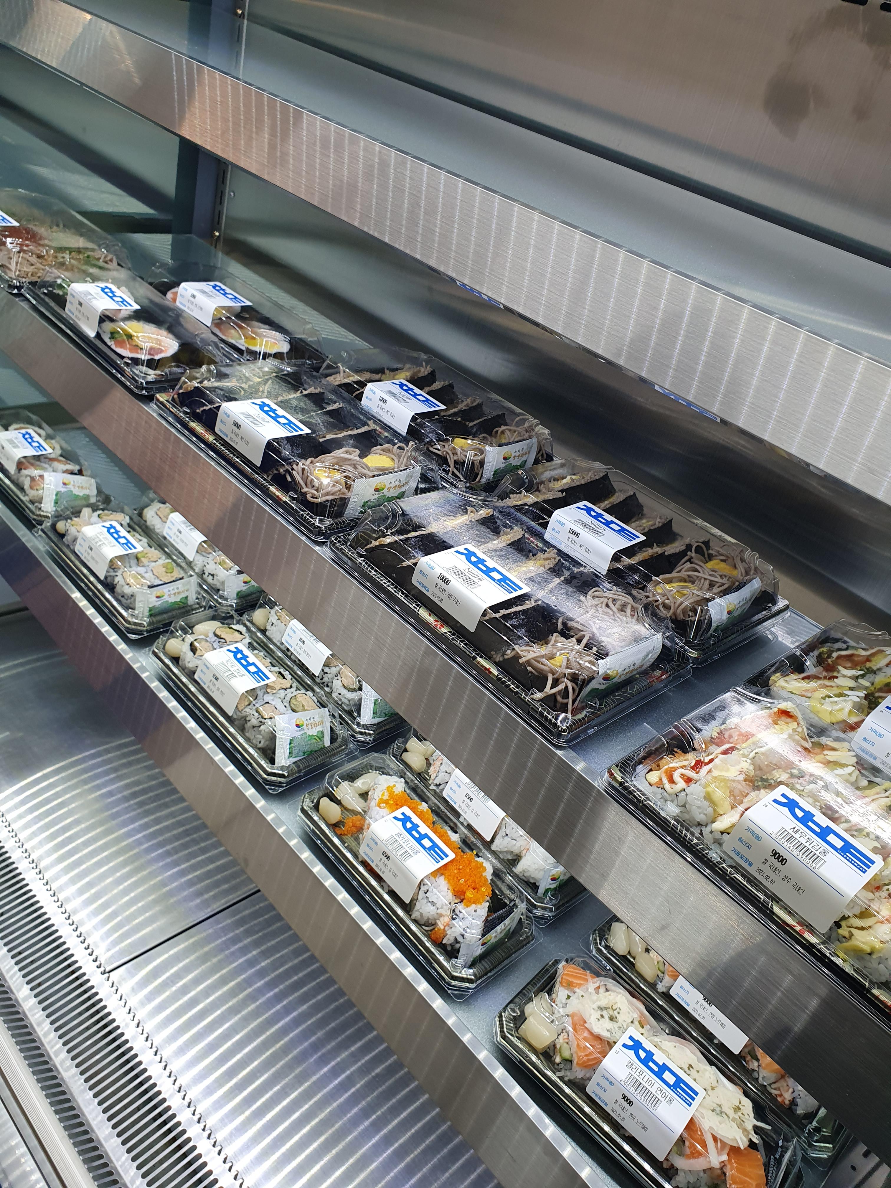 초밥과 사이드, 음료가 있는 쇼케이스는 이렇게 깔끔하게 포장이되어 진열되어있습니다.