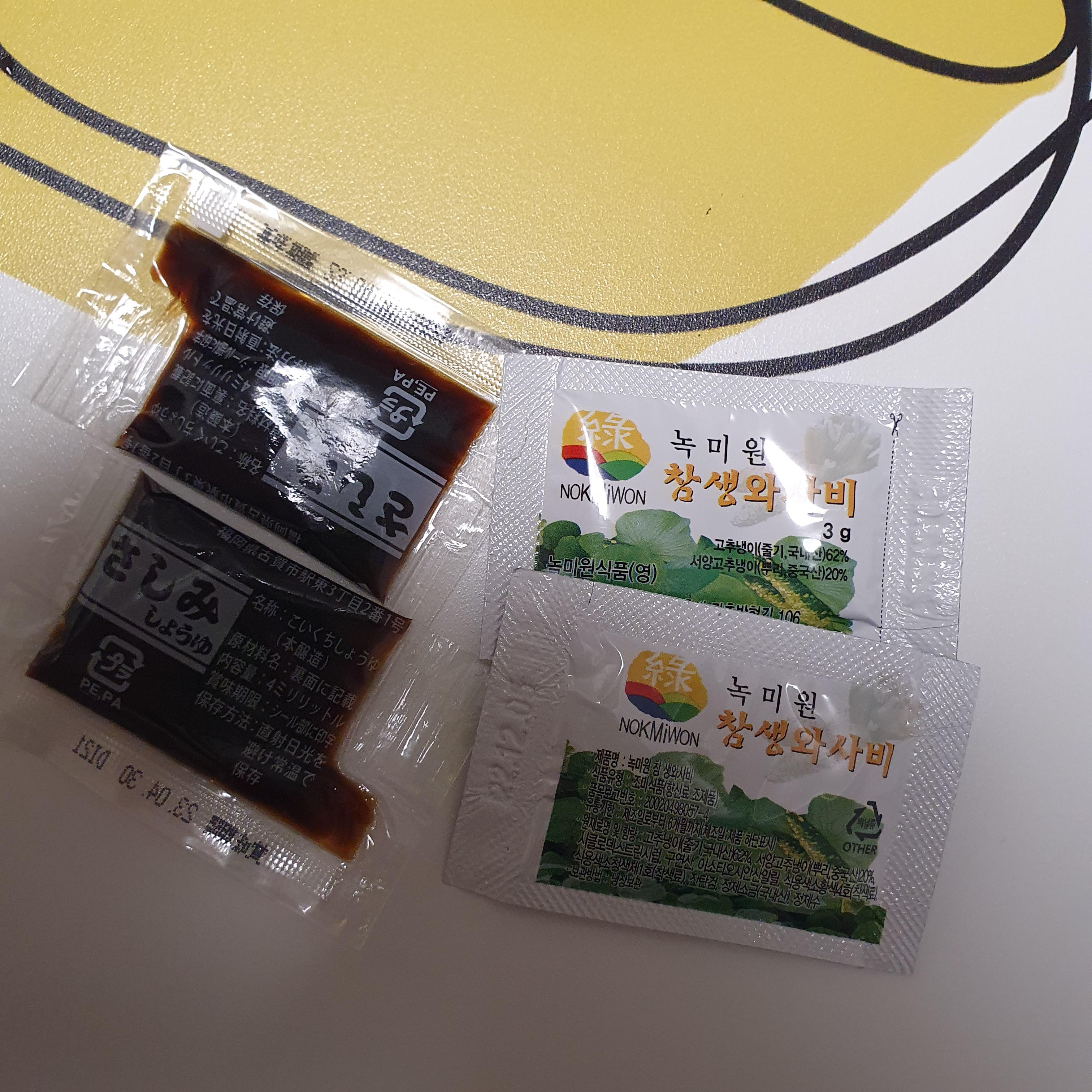 초밥에는 와바시와 간장이 한개씩 포함되어 있습니다.