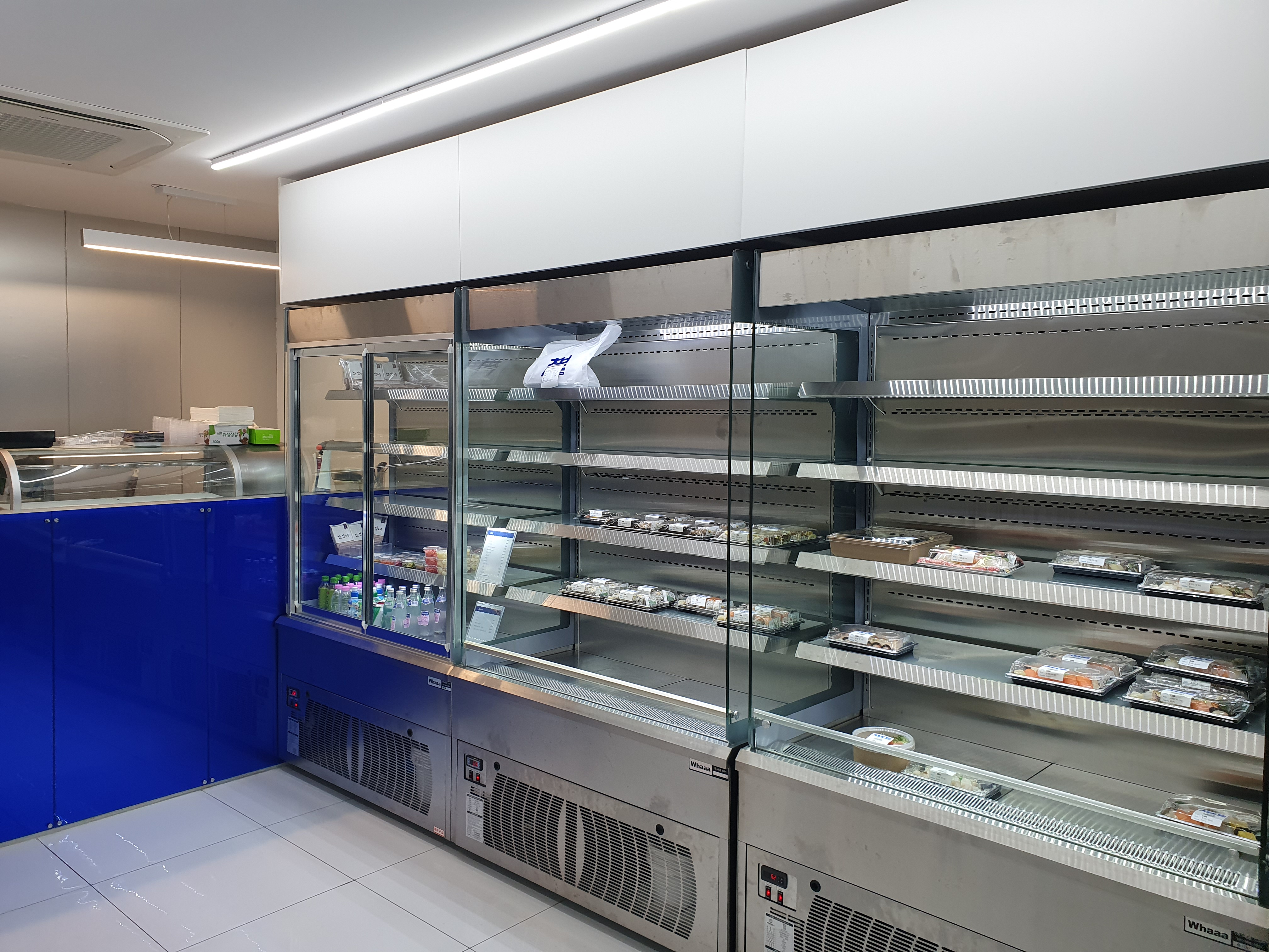 정면에 오른편에는 초밥과 음료, 사이드메뉴 등이 있는 쇼케이스가 있습니다.
