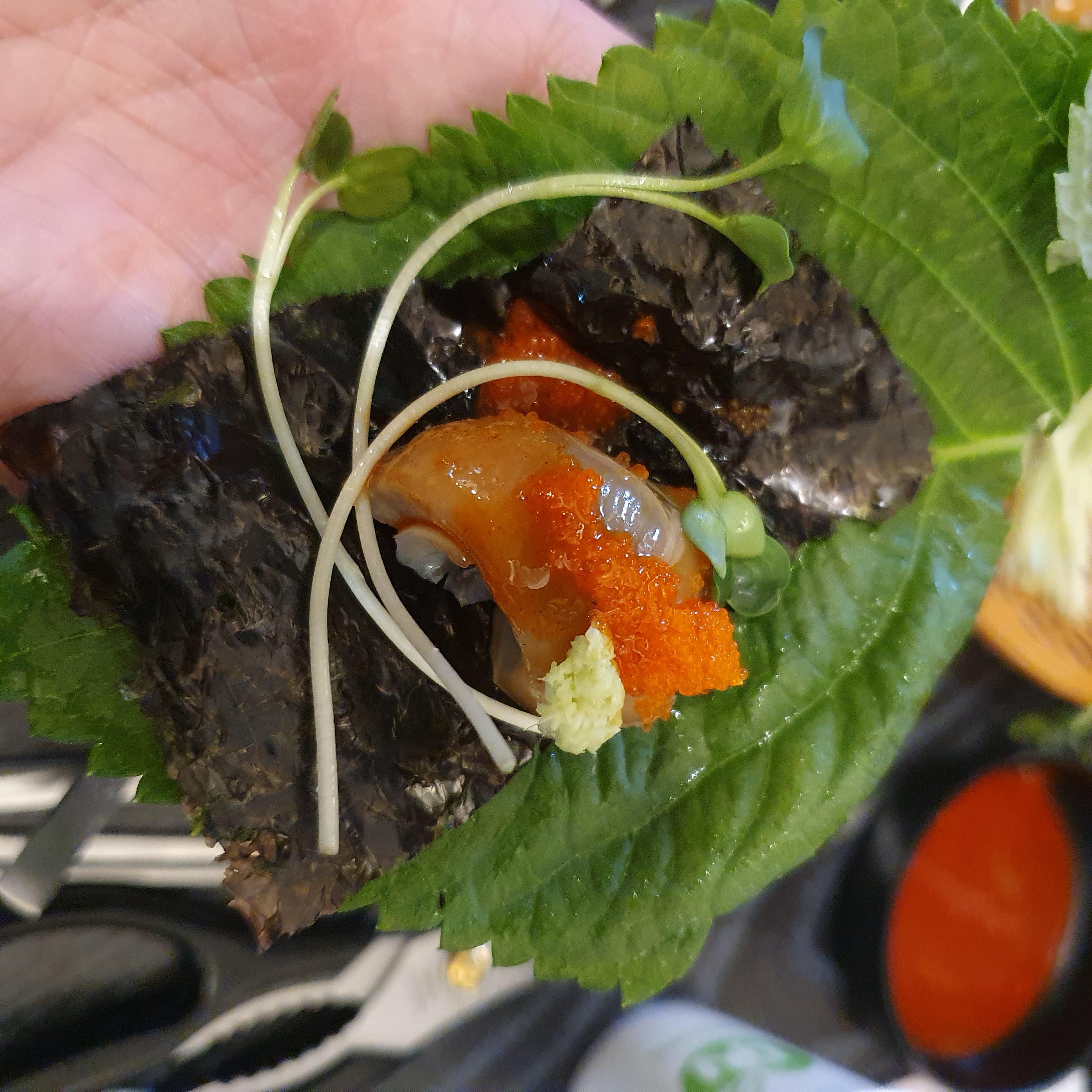 골뱅이를 초장에 찍고 날치알과 와사비를 올리고 무순을 올려 마무리 하는데요.