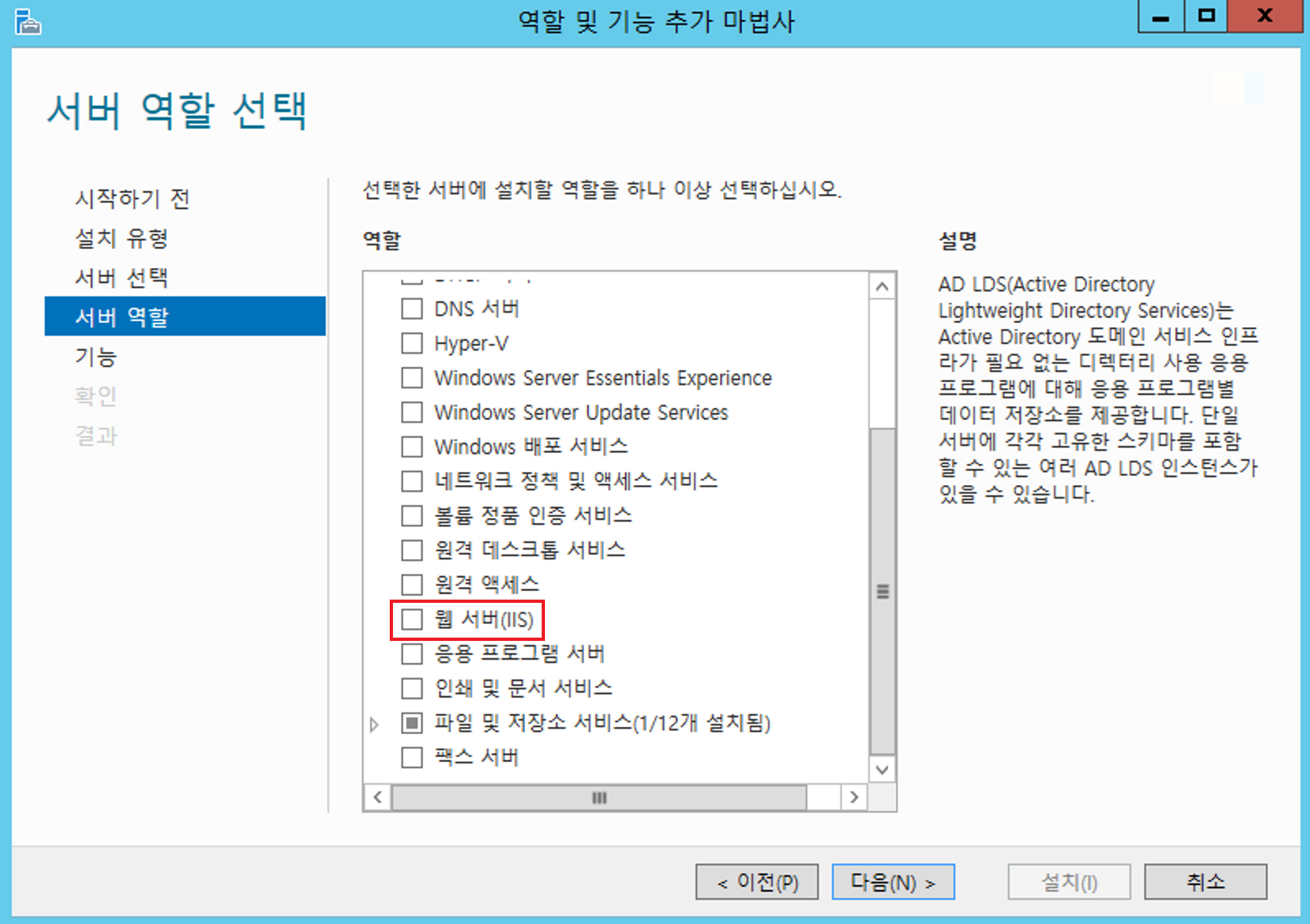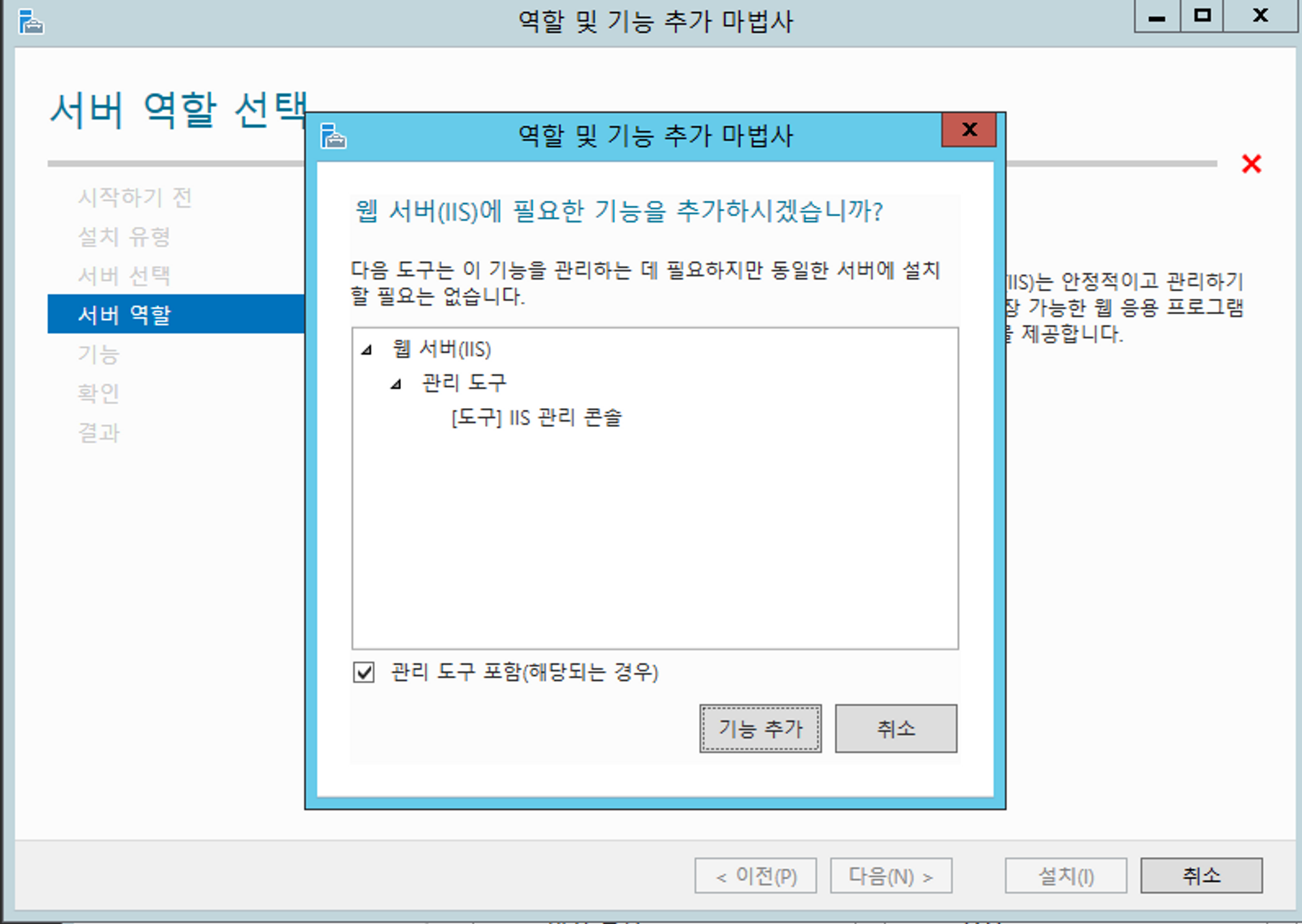 역할 목록 중 [웹 서버(IIS)] 를 클릭하여 관련 도구들의 기능을 추가합니다.