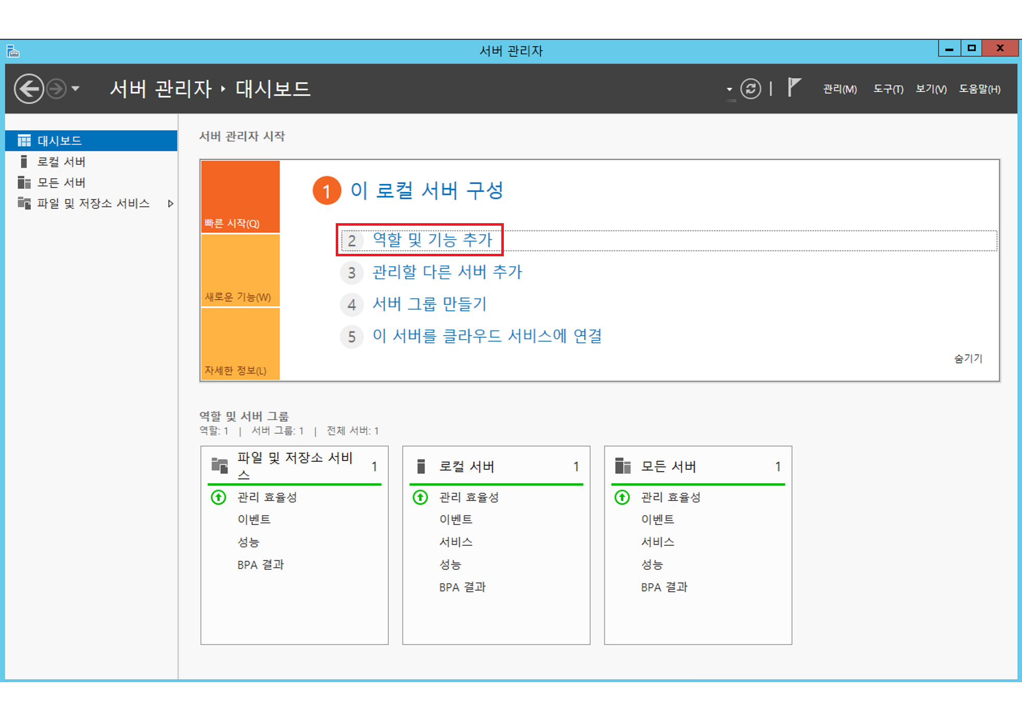 윈도우 서버의 서버 관리자를 실행하여, 역할 및 기능 추가 메뉴를 클릭합니다.
