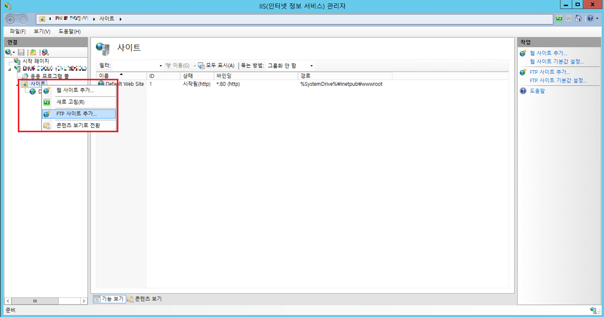 사이트 오른쪽 클릭 -> FTP 사이트 추가