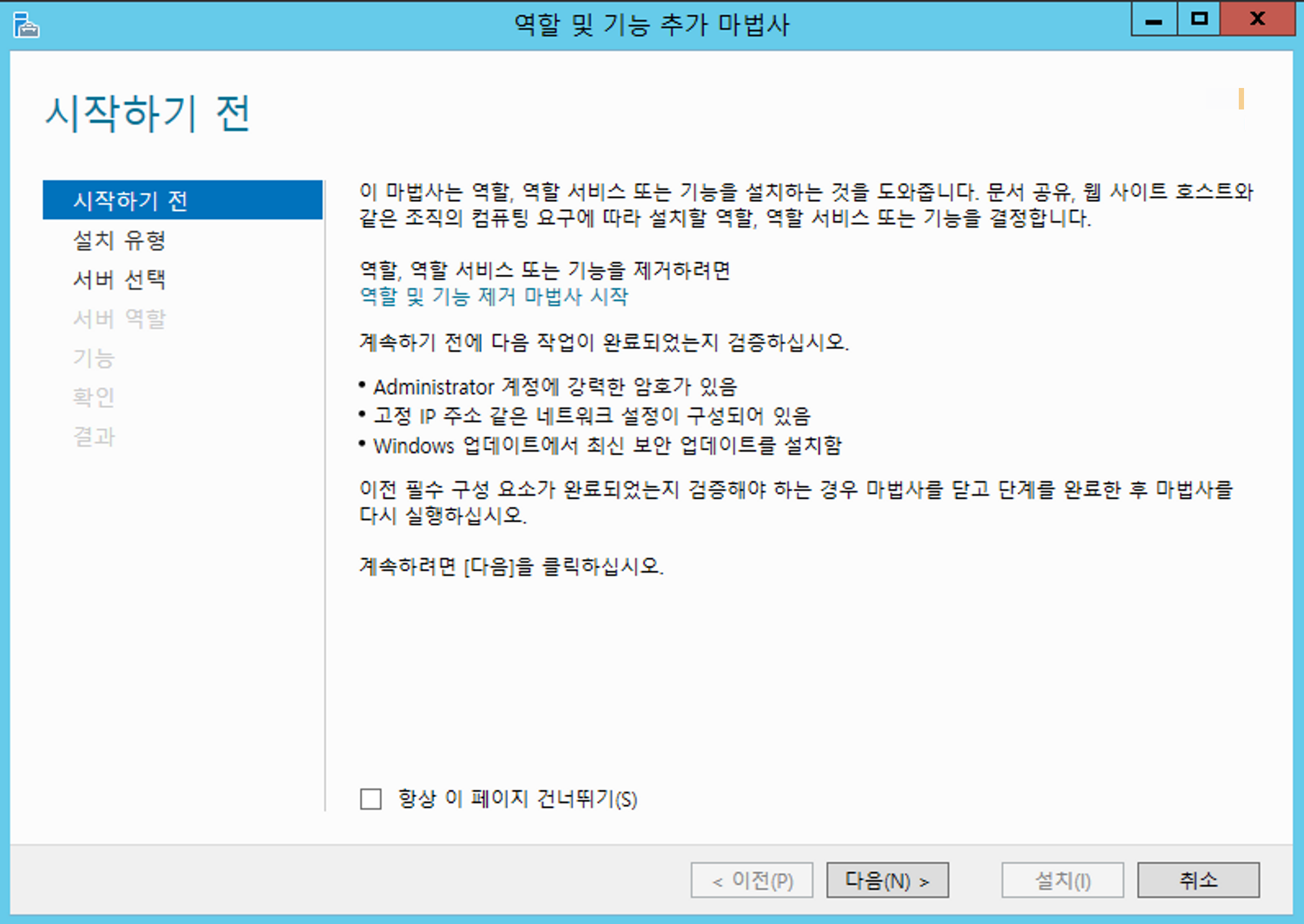 역할 및 기능 추가 마법사 창이 뜨면, [다음] 버튼을 눌러 [서버 역할] 메뉴까지 진행합니다.