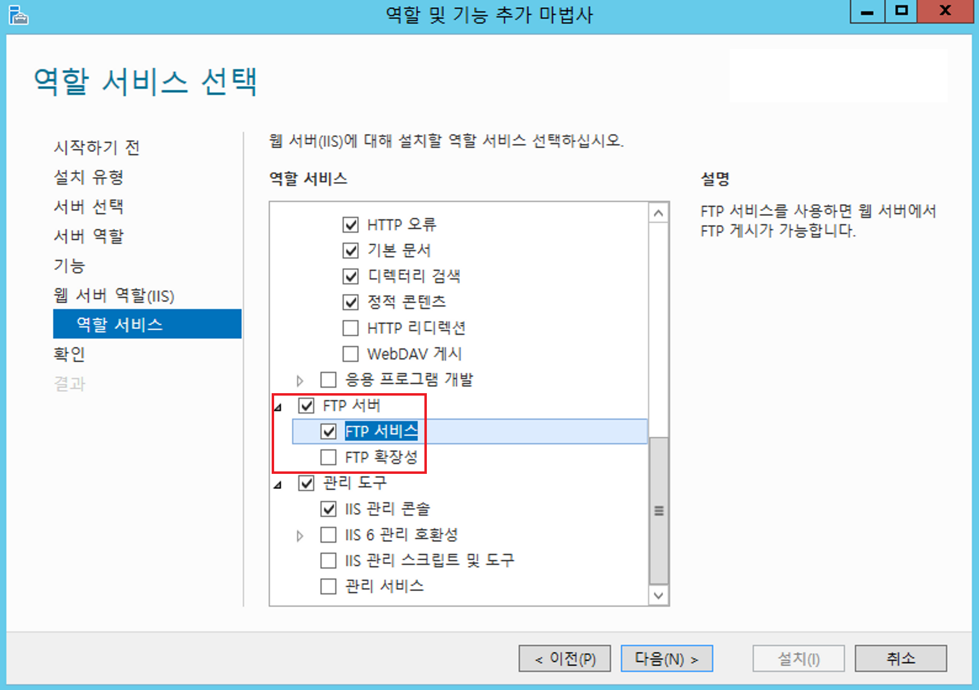 이때 기본적으로 FTP 서비스는 선택하며,
