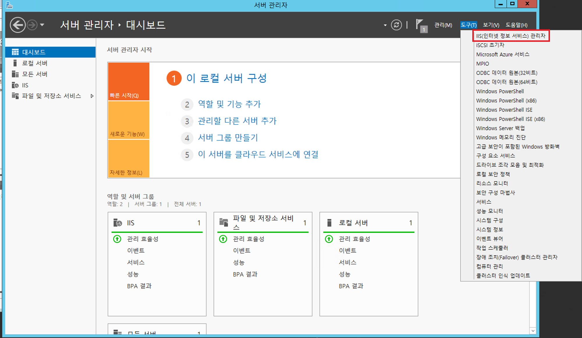 서버관리자 -> 도구 -> IIS(인터넷 정보 서비스) 관리자