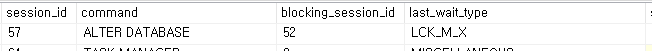 제가 alter databse 쿼리를 날린 57번 세션 ID, 미리 접속을 유지하고있던 52번 세션 ID를 확인 할 수 있는데요.