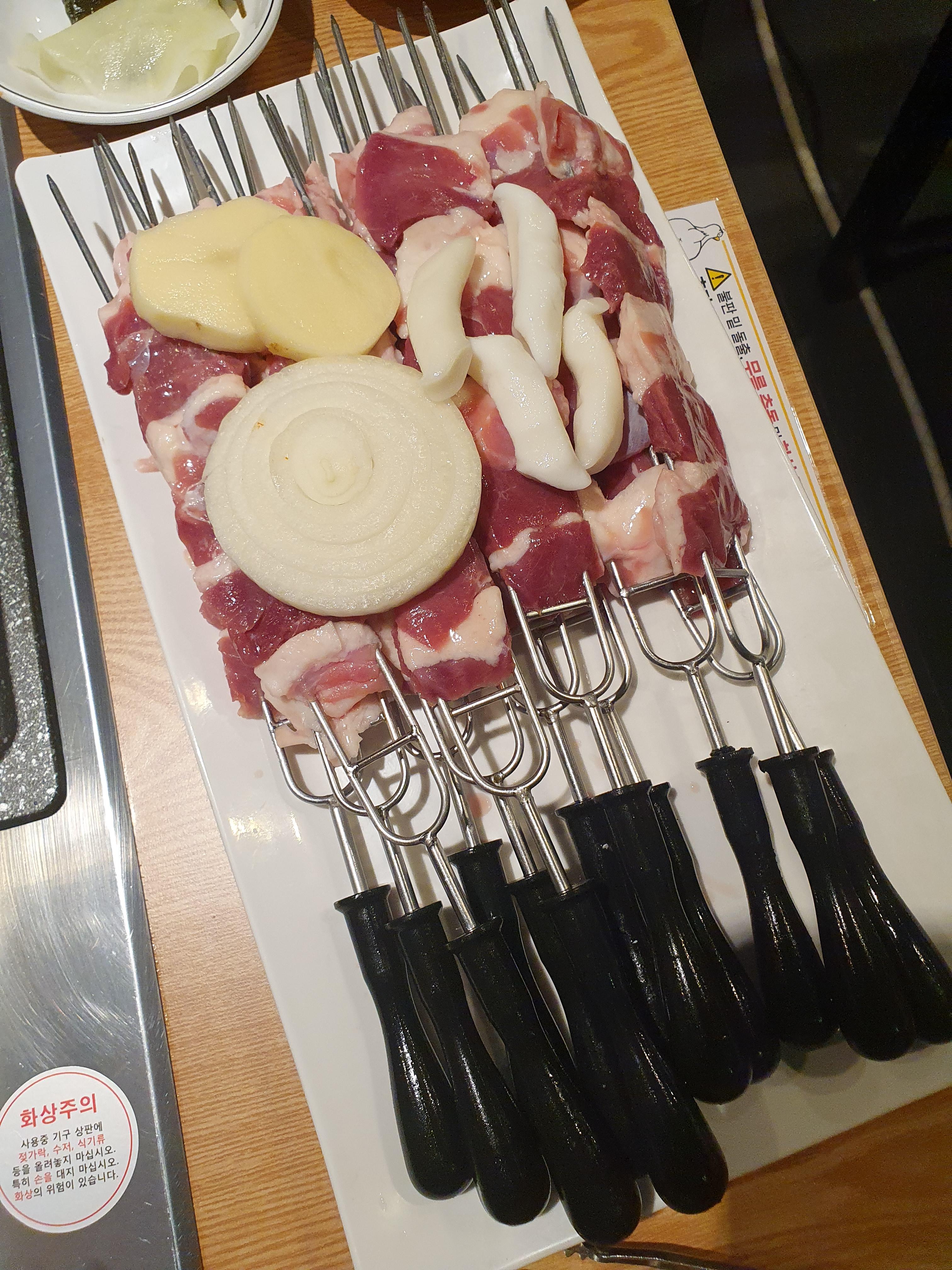 오리 한마리 꼬치를 주문하면, 이렇게 오리 꼬치 12개와 양파, 감자, 떡이 함께 나옵니다.