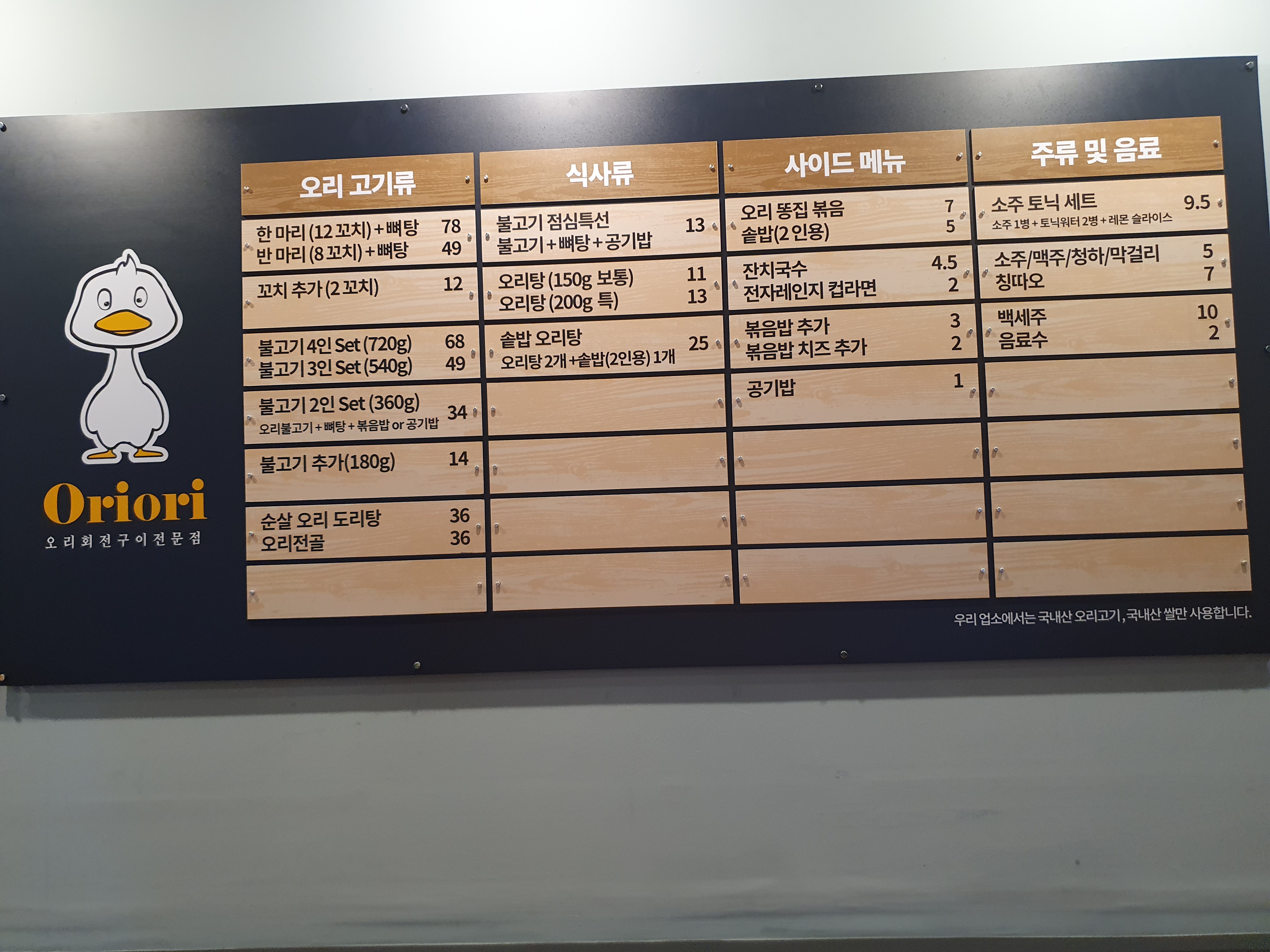 오리고기 메뉴, 식사류 메뉴, 사이드 메뉴로 구성되어있습니다.